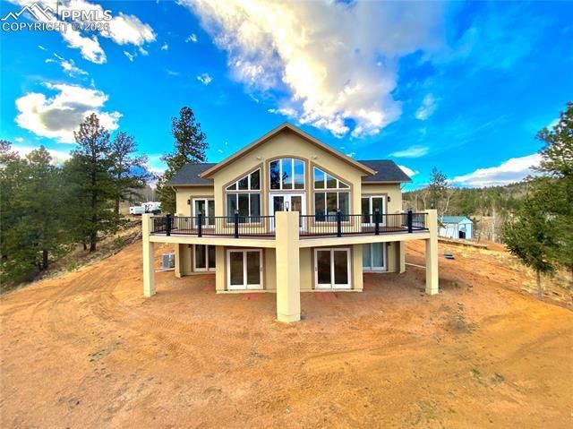 Close in mountain living with breathtaking views! Perfect as a primary home, vacation retreat or investment opportunity - great for an owner occupant or Airbnb. This beautiful custom home on a spacious 3 acre lot backs to open space and features 3 bedrooms (Primary on main, 2 secondary in basement), 2.5 baths, main floor great room, kitchen, finished walk-out basement (family room, 2 bedrooms, full bath) and a detached garage/workshop (2400 fin sq ft home + 720sq ft detached garage). The many windows allow the natural light to cascade in bright & cheerful and showcase the beautiful panoramic mountain views. The finished basement is perfect for guests or that teen wanting their own space. Beautiful upgrades and finishes including hickory cabinetry, slab granite in the kitchen, porcelain tile in the kitchen, wet bar in the walkout basement and wet rooms (baths & laundry)., vaulted / cathedral ceilings, multiple walk-out access points, custom lighting and more. Equipped with a 50-amp hookup for a hot tub and stubbed for gas on the deck - perfect for outdoor entertaining or just enjoying nature. Surrounded by beautiful foliage including Pine & Aspen Trees. A woodburning fireplace, 4-ton AC, ceiling fans and r-49 Climate Pro insulation throughout keeps this home comfortable all year long. Other features include a large garage/workshop with 10' doors and water hydrant, wiring for cable & ethernet; an upgraded 1800-gallon cistern, new septic, a 500-gallon propane tank and 220 service and more. The perfect blend of luxury and comfort makes this home a true oasis. Enjoy all that this stunning home and surrounding area has to offer. This home is a must see. Amenities abound in this fabulous community including a pool, clubhouse w/fitness center, fenced playground and library. Minutes from the town of Cripple Creek. Don't miss your opportunity. Welcome Home!